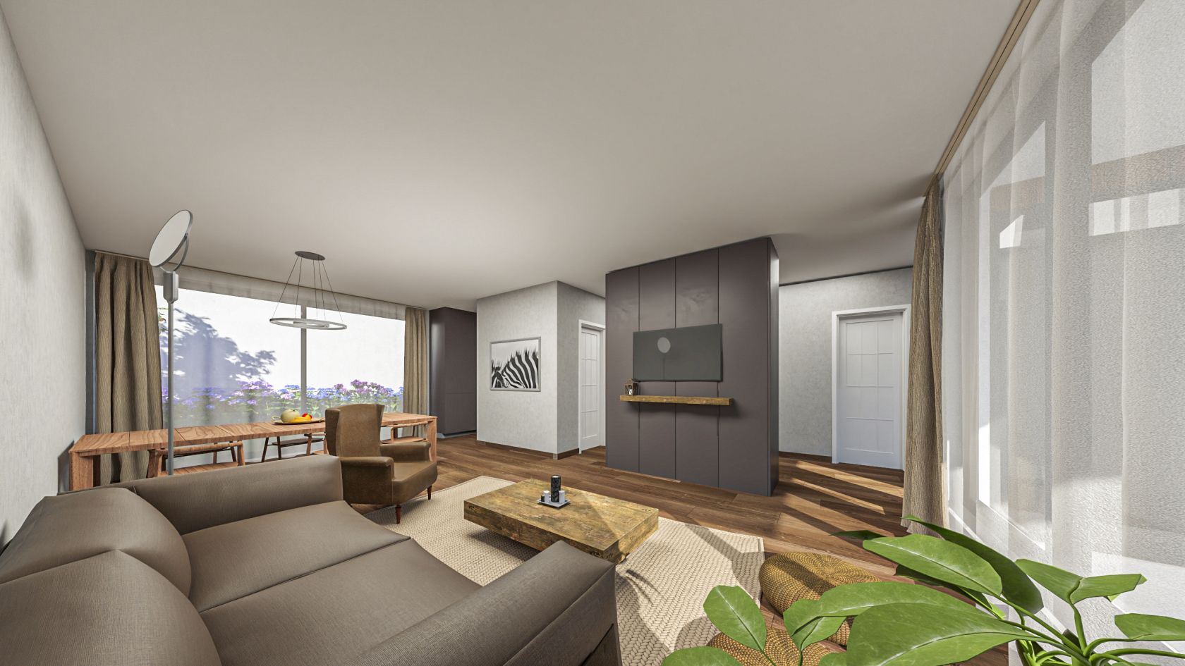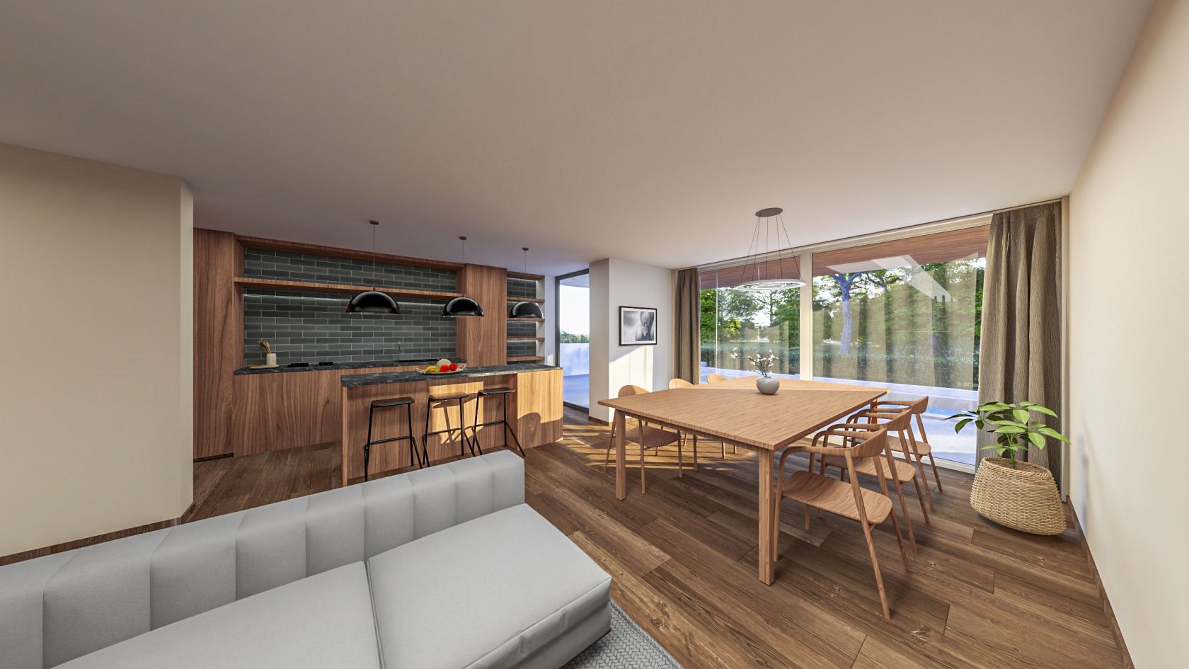 Mit einer Nutzfläche von 218 m² bietet diese anspruchsvolle Doppelhaushälfte ein perfektes Gleichgewicht zwischen Familienleben und Entspannung. Das Erdgeschoss ist nach Südwesten ausgerichtet und bietet einen atemberaubenden Blick auf den Sonnenuntergang. Es dient als soziales Zentrum mit einem geräumigen Wohnzimmer, einer separaten Küche und einem eigenen Büro.