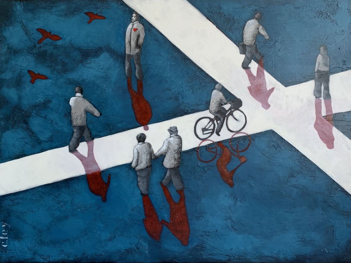 Questa figura misteriosa ha davvero catturato la mia attenzione quando ho visto per la prima volta il lavoro dell'artista, e speravo che Pascale facesse un po' di luce su di lui, ma lei ha affermato che è aperto all'interpretazione, ma ha gentilmente condiviso come è nato: "Un giorno ho avuto un'illusione e ho visto un uomo con un cappello e un grande cappotto su una bicicletta contro la pioggia e l'ho dipinto e ho pensato che mi piace quest'uomo; mi piacerebbe dipingere altri. Ricordo che pensai, devo dargli un nome, e ricordo che mio padre, quando non riusciva a ricordare il nome di qualcuno, gli dava il nome di George. George è anonimo, sono io, sei tu, sono tutti, quindi se gli do un volto, perde questo". George appare in molte opere di Pascale e lei ha spiegato che è il suo avatar e che dice agli altri quello che penso". È la sua figura caratteristica, tutti quelli che conoscono il suo lavoro conoscono George e anche se lei cerca di fare altre cose, torna sempre a George. Mi piace come cambia la sua forma e i suoi colori ogni volta e anche se costante, è anche in continua evoluzione, Pascale mi ha detto che non vuole essere prigioniera e che lui cambia per riflettere il suo umore e i suoi pensieri.