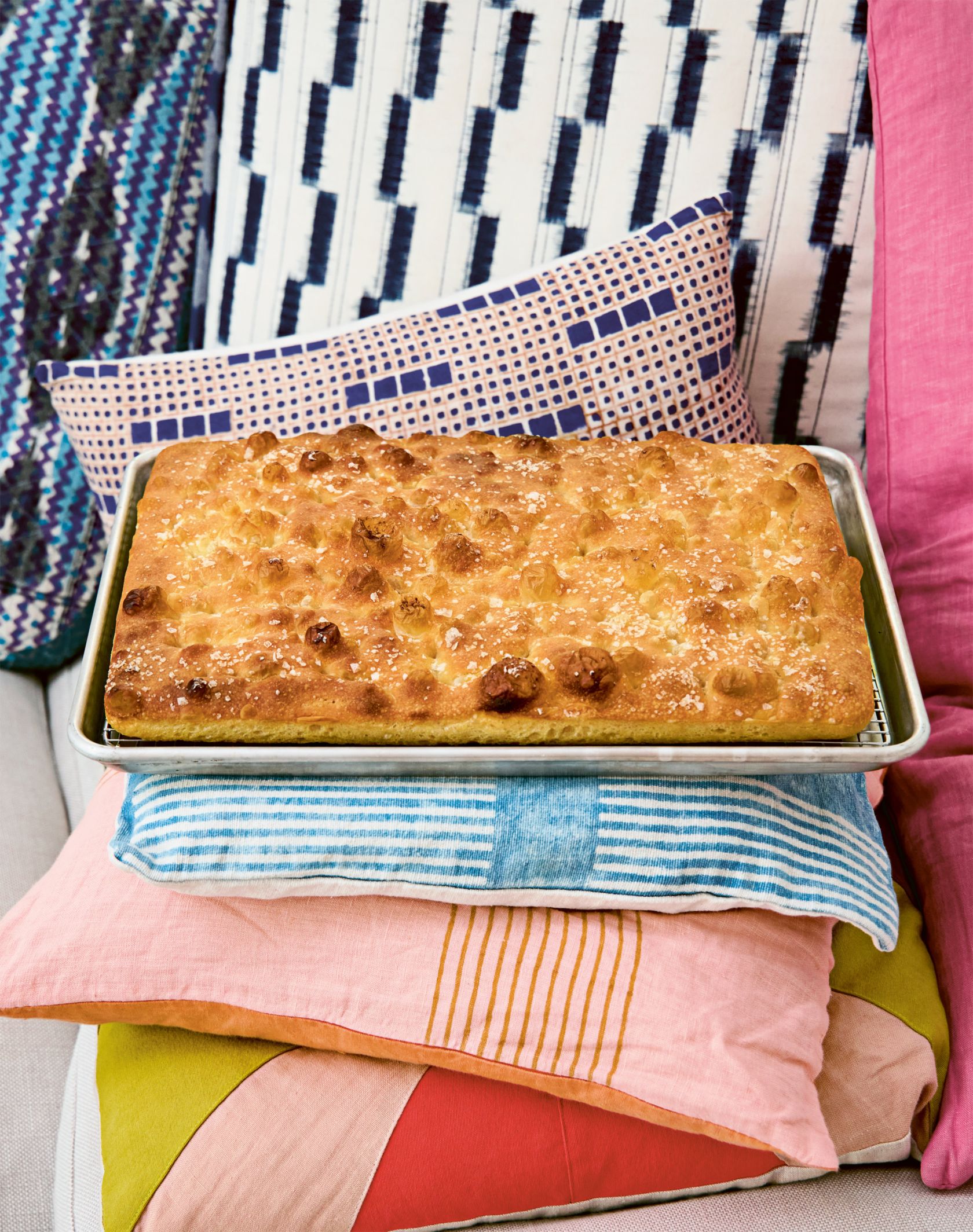 8. Entretanto, ajuste uma grelha do forno para a posição mais baixa, coloque um tabuleiro virado para cima na grelha e pré-aqueça a 230°C. Quando a massa estiver nivelada com o topo da forma, mergulhe as pontas dos dedos no óleo que se acumulou nos cantos da forma. Abra bem os dedos como um pianista e faça covinhas em toda a forma de massa, pressionando firmemente o fundo da forma (esta é a parte divertida!). Polvilhe uniformemente com sal grosso.